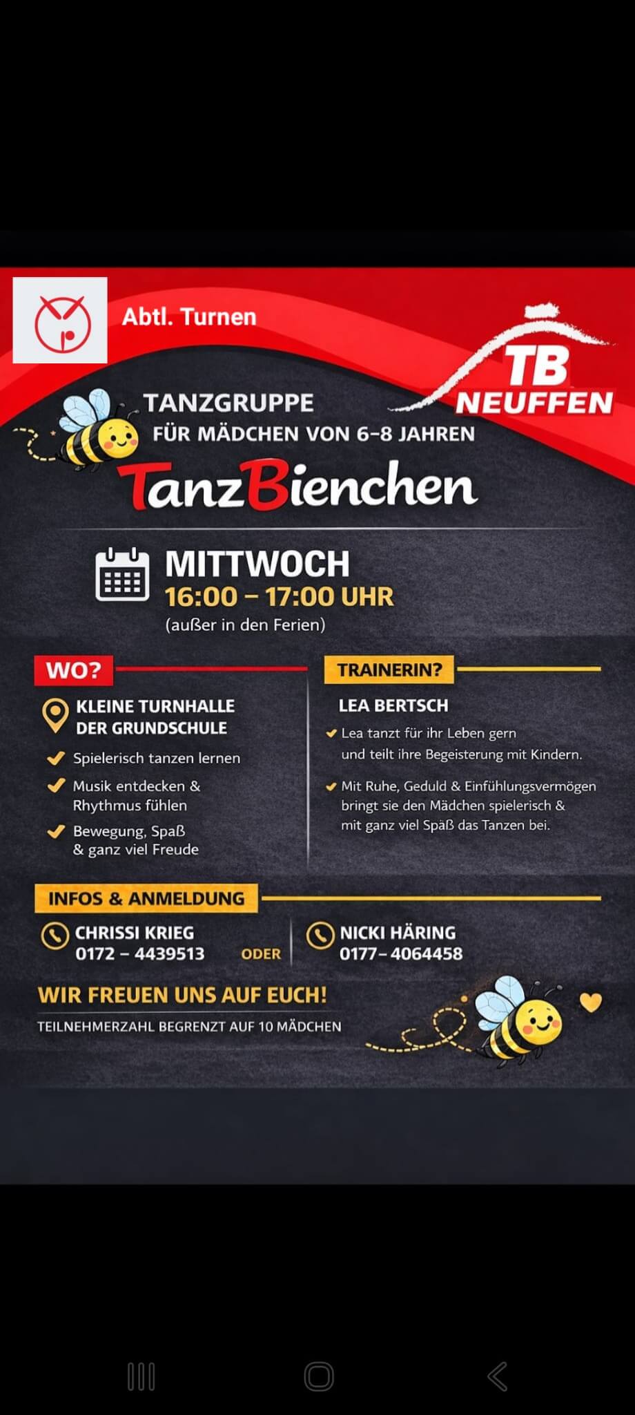 Die Trainerin Lea Bertsch freut sich auf die kleinen Bienchen, die Lust und Freude am Tanzen haben!