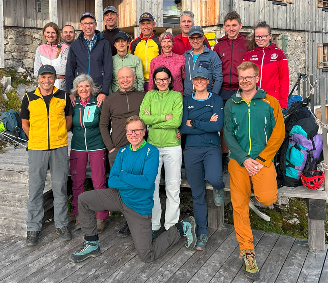 Der Morgen am Samstag empfing uns mit phantastischem Wetter. Kein einziges Wölklein war am Himmel zu sehen. Perfekte Bedingungen also für unsere ersten Aktionen. Eine kleine Gruppe machte sich an den recht schwierigen Klettersteig Leoganger Süd, die größere an den leichteren Leoganger Nord, die beide auf den Mitterspitzen (2160 m) münden. Wir genossen das Gipfelglück mit herrlichen Ausblicken hinab ins Salzburger Land. Zurück in der Hütte und nach kurzer Stärkung ging es dann an die Nachmittagstour. Das Birnhorn ist mit einer Höhe von 2634 m der höchste Berg der Leoganger Steinberge. In gut zwei Stunden war der Aufstieg in leichter Kletterei von etwa 800 Höhenmetern bewältigt, und wir durften auf dem Gipfel einen Rundumblick der Extraklasse erleben. Im Norden thronten Watzmann und Hochkönig und im Süden lag der schneebedeckte Großvenediger vor uns. Nachdem wir gegen 18 Uhr zurück zur Hütte gelangt sind, lagen sehr eindrucksvolle Bergerlebnisse hinter uns. Verständlich wohl, dass der Abend in der gemütlichen Hütte entsprechend fröhlich verbracht wurde.