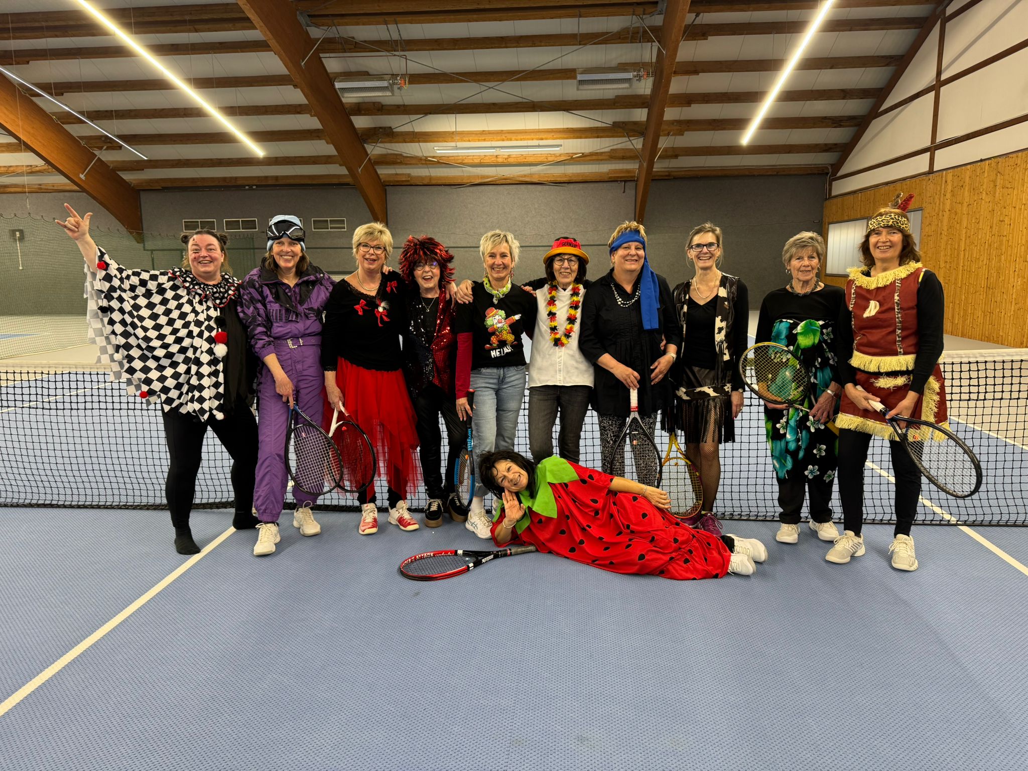 Donnerstag-Nachmittag ist Tennis-Nachmittag bei den Hobby-Damen, und das gilt auch an Weiberfastnacht. Wer will kommt verkleidet, und wer nicht will, macht’s meistens trotzdem. So fand sich letzte Woche eine bunte Truppe zum Doppel-Spielen ein. Da spielten z.B. Indianerin gegen Harlekin, Erdbeere gegen Fußballerin und mit der passenden musikalischen Untermalung wurde die Halle zu einer Art Tennis-Disco umfunktioniert. Nach dem Spielspaß gesellte sich noch eine unserer Verletzten Mitspielerinnen (auch verkleidet) zum gemütlichen Teil mit Kaffee und Kuchen dazu. Und mit einem Gläschen Sekt zum Abschluss waren wir auf die Faschingstage eingestimmt.