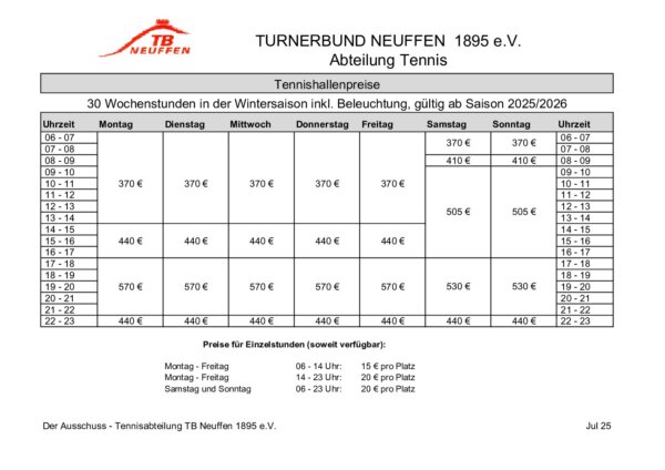 Wir vermieten freie Stunden in unserer energetisch umfassend renovierten Zweifeld- Tennishalle. Die LED-Beleuchtungsanlage gewährleistet eine blendungsfreie Ausleuchtung der Tenniscourts. Eine moderne Heizungsanlage sorgt für behagliche Wärme. Der gelenkschonende Hallenteppichboden garantiert optimales Ballverhalten beim Tennisspiel. Alle Nebenkosten sind in den Preisen enthalten.